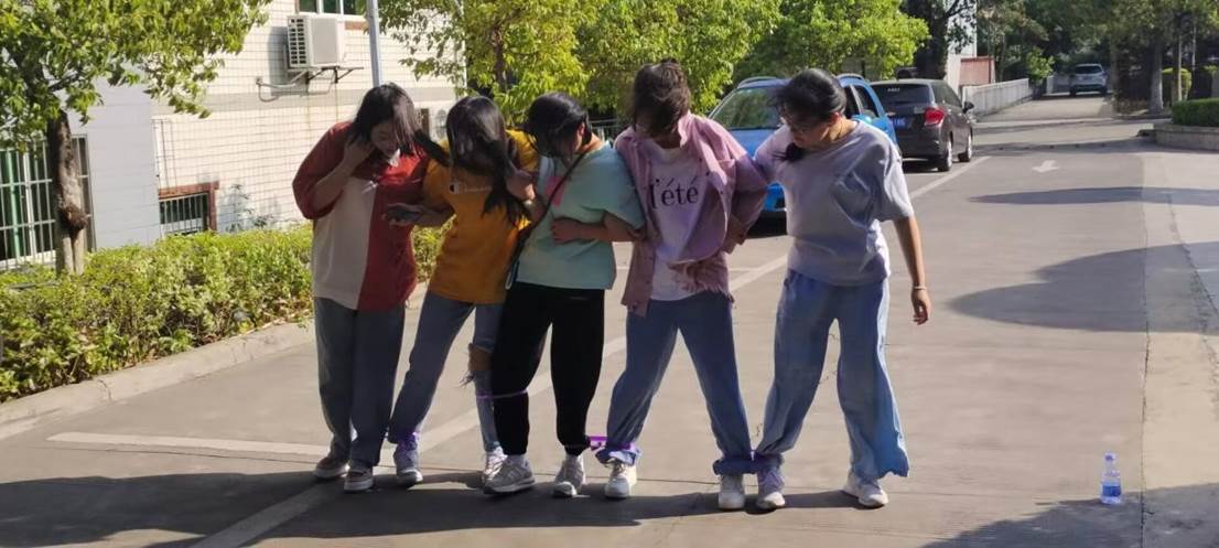 “五人六足”,将相邻两人的脚绑在一起,之后相互协作走到指定位置。尽管游戏一开始的时候,同学们都不习惯,第一组的同学每一步都是步履蹒跚,跌跌撞撞。但是随着游戏的进行,同组的伙伴之间磨合得越来越好,配合也越发默契,走起来也是越发自然,越发流畅。最后所有小组都顺利到达终点。通过此游戏,所有同学都认识到了伙伴的重要,同学之间的协作精神也越发浓郁,同时,不少同学都对彼此有了更深层次的了解,极大增强了同学之间的情感。