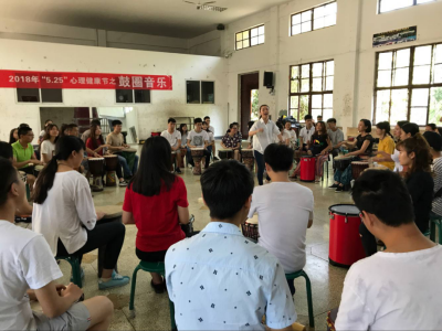 活动开展前,代俊老师与何旋老师进行详细沟通,对鼓圈音乐团体辅导进行了仔细设计。由于此次活动人数众多,在何老师的努力下,获得了阳光琴行的支持,为我们免费提供了40个鼓来使用,并邀请专业音乐人士参与。