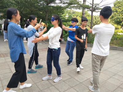 活动第一项,何老师介绍了鼓圈音乐治疗的相关理论知识,并向大家简单介绍了各种鼓乐的使用方法。接着,何老师提出了“导航”一词,由此展开热身活动。何老师将同学们分为两人一组,其中一人为导航者,另一人为被导航者,导航者引领被导航者在蒙眼下走上三分钟并回到原来的位置。要顺利完成这项任务,在开始阶段两人要商定好规则,比如什么声音代表走,什么声音代表停。而中间阶段则需要导航者负起责任,观察周围的情况,准确导航,从而保护搭档不被其他人碰撞,让他安全地走完全程。而被导航者则要仔细辨别自己组乐器发出的声音,并信任自己的搭档,跟着声音的导航走。小小的活动需要双方的默契,体现了搭档之间的高度配合,让同学们体会到沟通、倾听与信任的重要性。