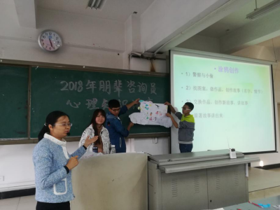 活动部分,首先,袁老师让同学们选择自己喜欢的彩色纸条,按颜色分组,每组选出一个组长。简单的分组让同学们了解并认识到了团体形成的过程和必要步骤。第二项,“滚雪球”,让小组成员相互认识。小小的活动需要同学们充分交流,认真记忆,体现了人际交往中至关重要的一点“倾听”,让同学们更用心地认识他人。第三项, “涂鸦制作”。这个活动很有趣:第一环节,两位同学在纸上玩警察追小偷的游戏,形成两张涂鸦图。然后,同学们充分发挥想象力,在涂鸦图上寻找图案,用蜡笔勾勒、填充那些图,用剪刀将图片剪下来。接着,在另一张大白纸上同学们用剪下的图案拼出一幅作品,并编一个故事。下一个环节,相邻两组交换作品,创作新故事。同学们使尽浑身解数,一起努力创作。第四项,同学们分享活动中的感受。“原来同一个事物,每个人看到都有不同的想法,编出的故事也大不相同。”“刚开始我还不能融入团体,通过参加团体活动,我对这个团体就有了归属感。”“我最害怕和别人没有共同点,原来共同点只靠一张有颜色的小纸条就会形成。”“大家都很投入这个涂鸦创作,我很高兴能参与这次培训”。大家各抒己见,说出了活动带给自己的收获。通过此次一系列的活动,让同学们体会到每个人的独特性,只有学会真诚地沟通与交流,才能真正地了解别人,让彼此的心接近。