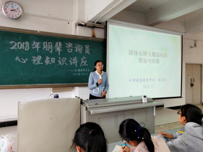 2018年11月4日下午3:00,心理健康教育中心袁晓艳老师在尚学楼(二教)2-501教室,举办了以“团体心理活动的理论与实操”为主题的心理知识讲座。此次讲座面向大学生心理协会的会员以及各二级学院心理健康部干事、校心理健康部干部开展。