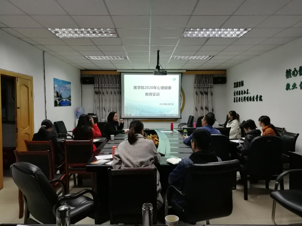 2020年1月7日,医学院在西苑办公楼三楼会议室举行心理健康教育实训活动。心理健康中心代俊、袁晓艳、李仁莉,医学院党委书记张勤、副书记陈恺以及全体辅导员参加了实训活动。
