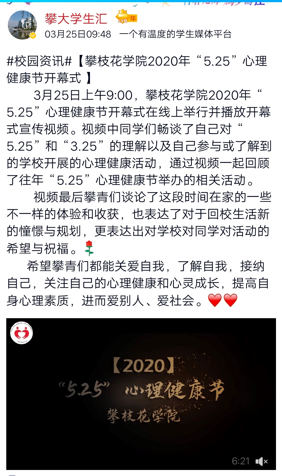 今天是2020年5月25日,全国大学生心理健康日。“5.25”谐音即“我爱我”,提醒大学生珍惜生命,关爱自己。