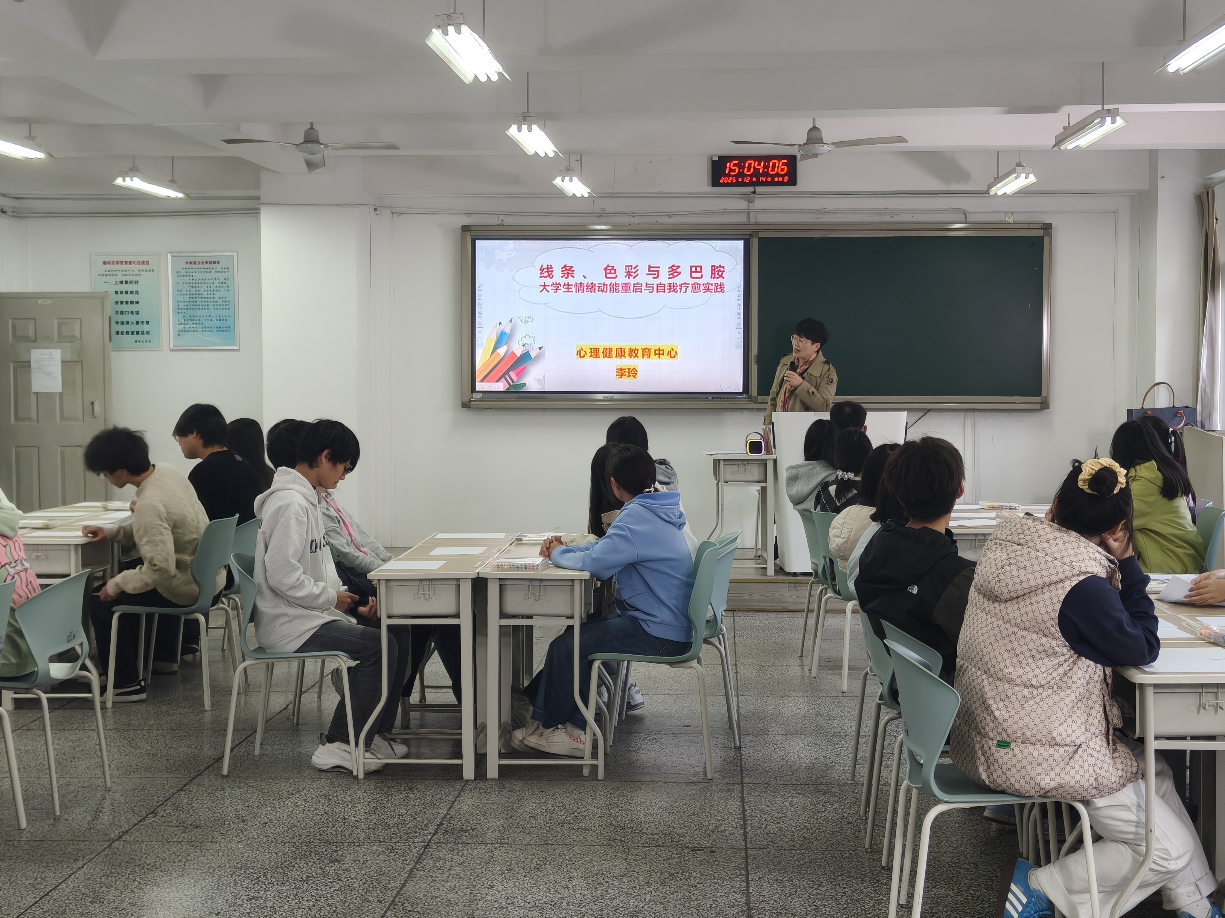 为帮助大学生探索情绪表达新路径,挖掘潜意识中的自我能量,12 月 14 日下午,我校心理健康教育中心李玲老师在二教 2-006 教室成功开展 “线条、色彩与多巴胺 —— 大学生情绪动能重启与自我疗愈实践”主题心理讲座。讲座面向大学生心理协会成员、各学院心理部骨干及心理健康教育中心教师,吸引了众多师生积极参与。
