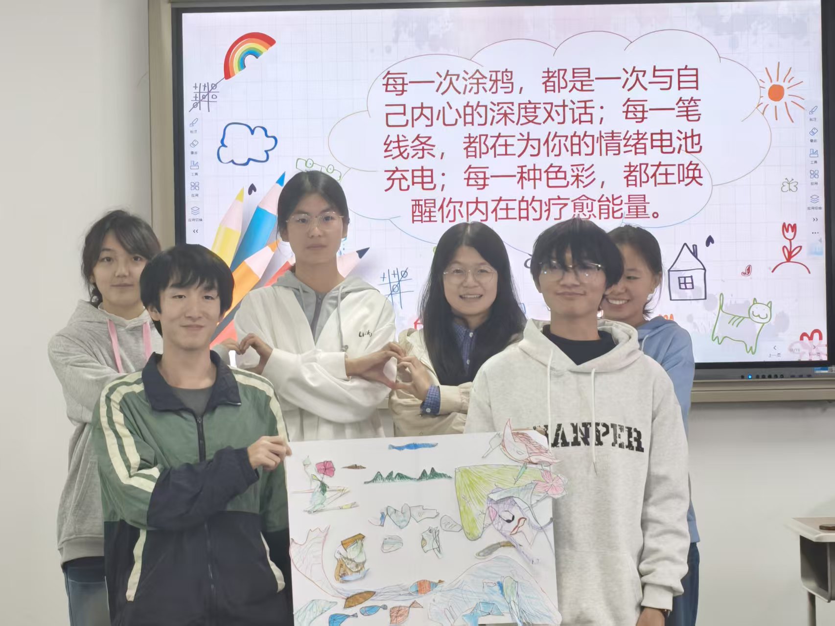 本次讲座以涂鸦疗愈为核心载体,将心理调适技巧融入趣味互动之中,不仅让同学们在实践中觉察自身隐藏情绪,完成了一次深刻的自我探索与治愈之旅,更有效提升了大家的心理调适能力与团队协作意识。讲座活动为我校大学生心理健康教育工作注入新活力,为学生心理健康成长筑牢坚实基础,也为校园心理育人氛围的营造提供了有力支撑。